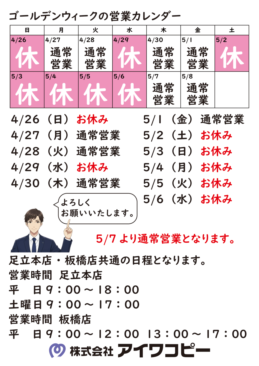 5月の大型連休、ゴールデンウィークのお知らせをさせていただきます。